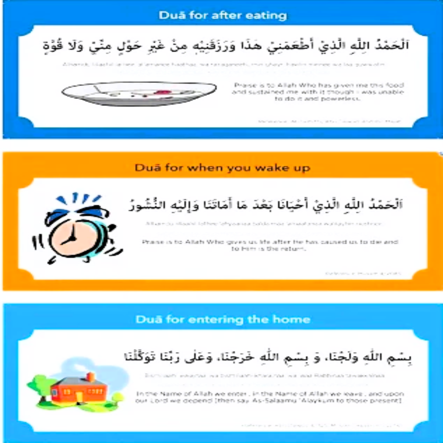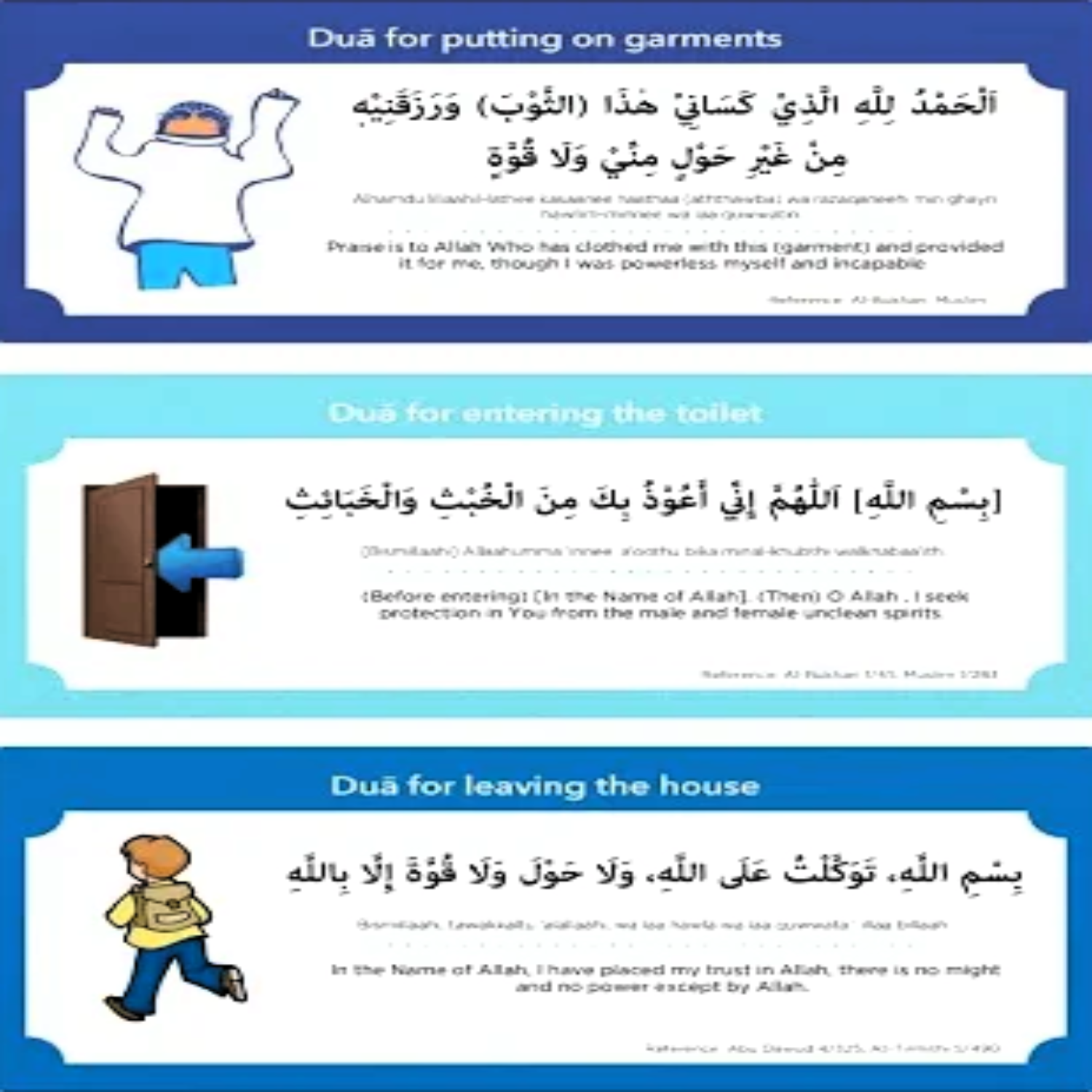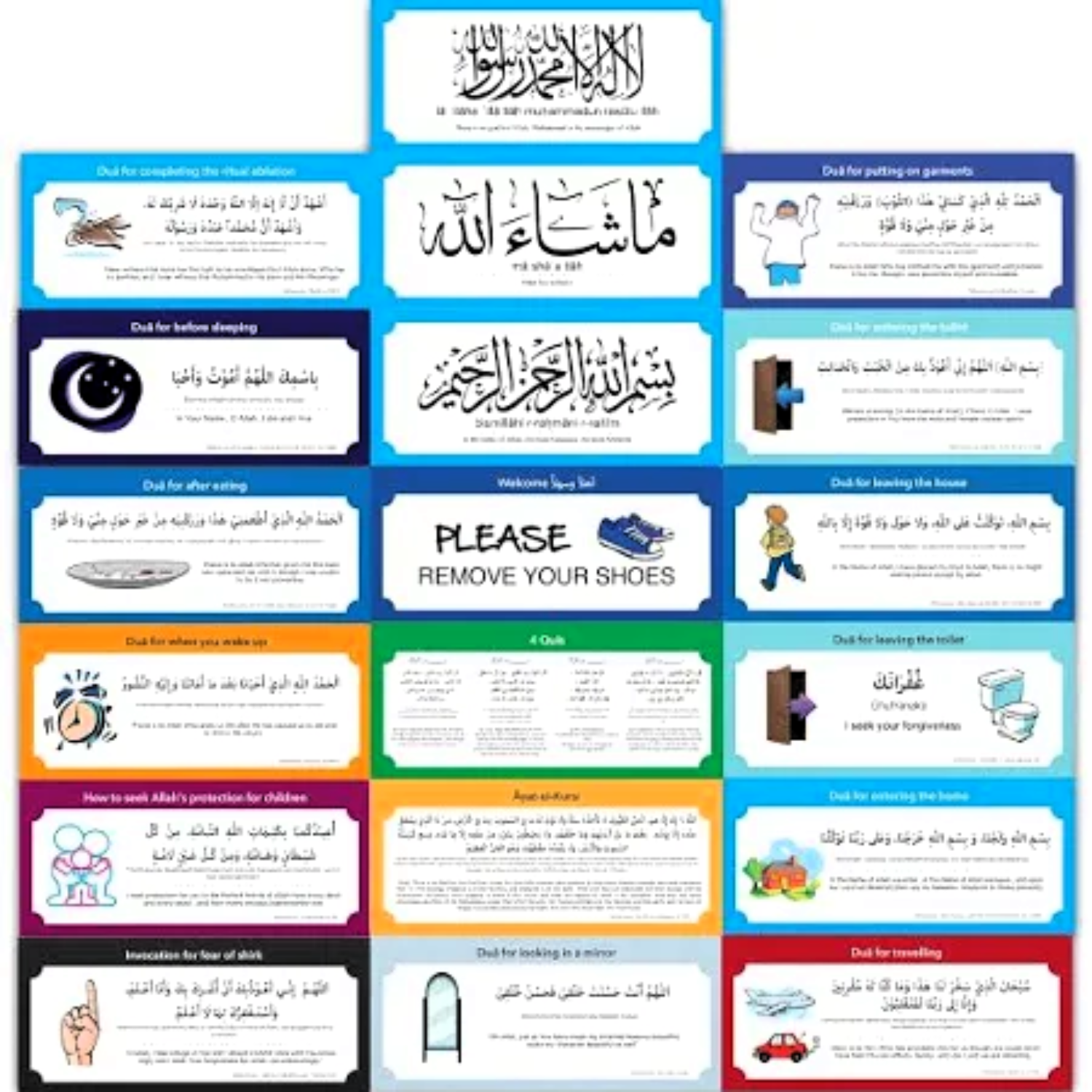This pack contains 19 high-quality stickers, each featuring a dua in three languages: Arabic, ENGLISH, and 3 IN 1 translation. Each sticker measures 3.5 inches x 7.8 inches and is coated with durable PVC. The pack includes a variety of everyday duas such as those for waking up, using the toilet, leaving and entering home, and traveling.