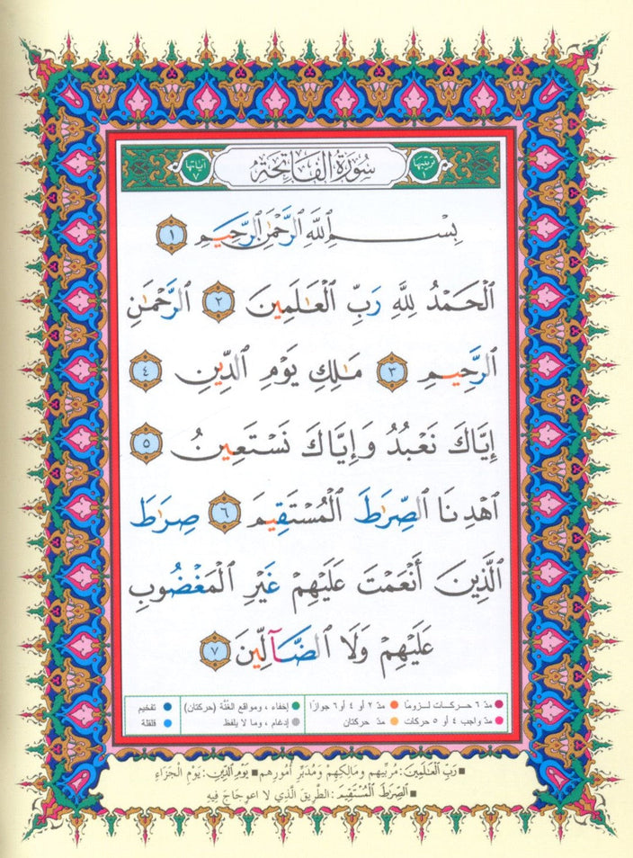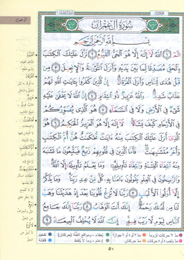 This edition of the Holy Qur'an clarifies its words and meanings by including lengthy explanations in the margins. In this Mus-haf, letters pertaining to Tajweed regulations are separated within the text by the use of colors to indicate areas of sluggish recitation. This technique simplifies the rules of recitation for the reader, encouraging and facilitating perfect Qur'anic recitation.