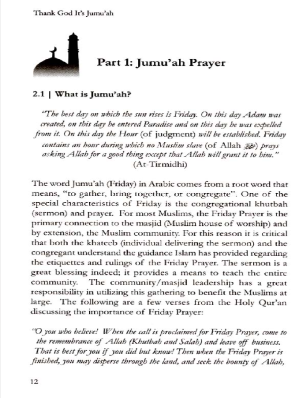 Experience the blessings of Friday with T.G.I JUMU'AH—the ultimate guide to understanding and appreciating the profound significance of Jumu'ah prayer in Muslim communities worldwide. Authored by industry experts and respected leaders in youth organizing, this comprehensive resource delivers an insightful and informative perspective on this sacred day of worship and communal gathering. This thoughtfully crafted book explores the spiritual dimensions, historical context, and contemporary relevance of Jumu'ah, helping readers deepen their connection to this fundamental Islamic practice. Whether you're seeking to strengthen your faith, engage younger generations, or gain a more nuanced understanding of Islamic traditions, this work provides accessible yet authoritative guidance. Leave your daily routine behind and embrace the transformative power of submission to God. Discover why "Thank God it's Jumu'ah" resonates as both a spiritual affirmation and a celebration of community. Perfect for individuals, families, and community organizations looking to enrich their understanding of Islamic practice and foster meaningful engagement with faith.