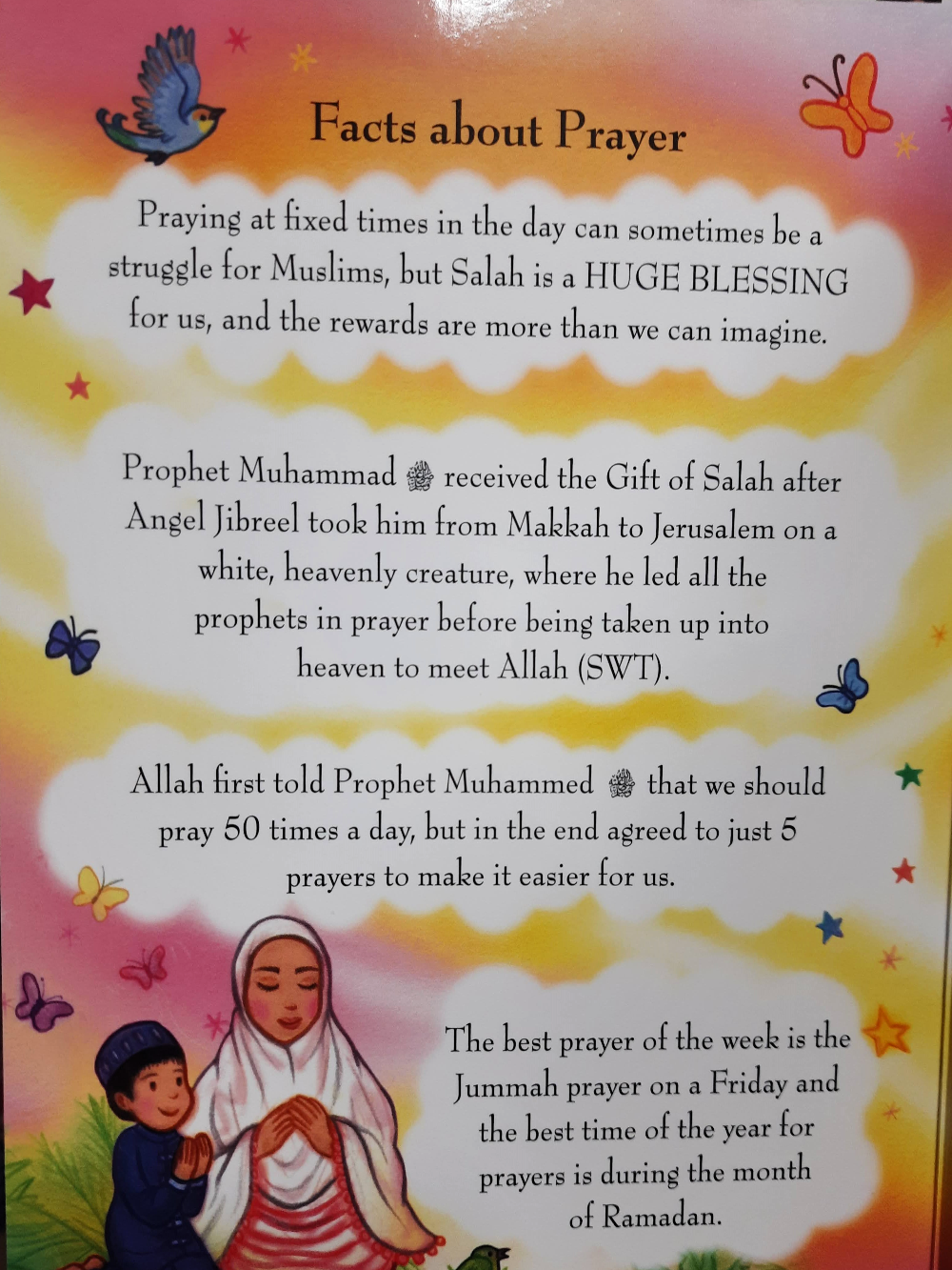 My First Book About Salah helps young children learn about Salah (prayer) in a simple and friendly way. It explains what Salah is, why Muslims pray, and how prayer brings them closer to Allah. The book introduces the five daily prayers and basic prayer movements using clear and gentle language. Perfect for early learners, it encourages a love for prayer, builds good habits from a young age, and supports a happy beginning to a child’s faith journey.