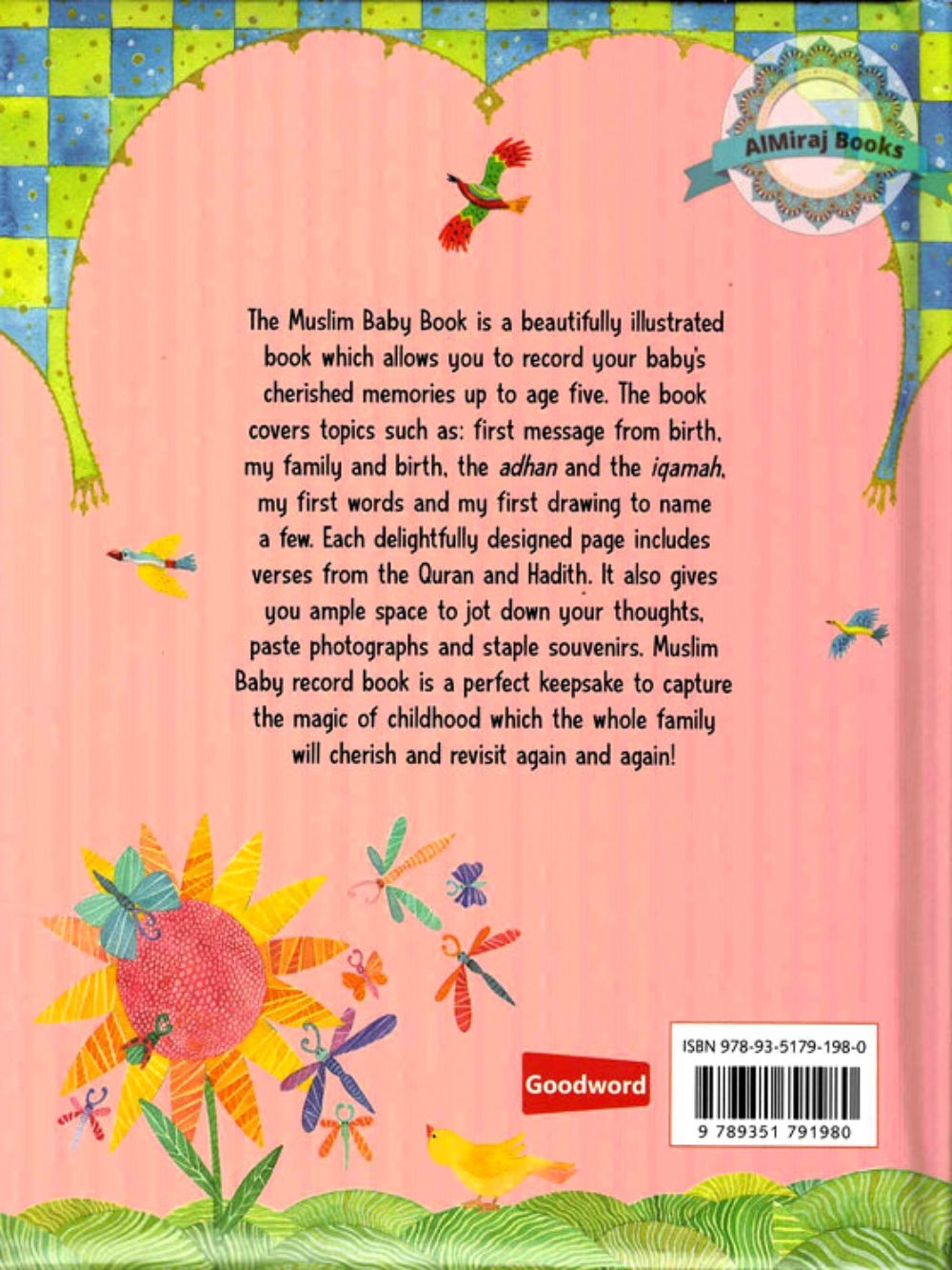 Muslim Baby Book (For Girls) The Muslim Baby Book is a beautifully illustrated book that allows you to record your baby’s cherished memories up to age five. The book covers topics such as: first message from birth, my family and birth, the adhan and the iqamah, my first words and my first drawing to name a few. Each delightfully designed page includes verses from the Quran and Hadith. It also gives you ample space to jot down your thoughts, paste photographs, and staple souvenirs. Muslim Baby record book is a perfect keepsake to capture the magic of childhood which the whole family will cherish and revisit again and again!