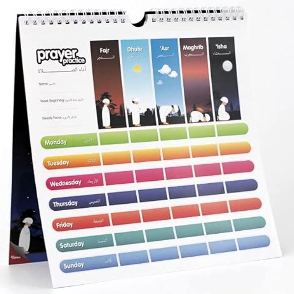 Prayer Practice Calendar Set (Learning Roots) Ages 5 to 12+ is a fun and interactive way to help children learn and practice the five daily prayers. Each set includes eight colorful charts, a children’s Qibla direction arrow, and stickers, all bound together in a handy flip-chart format. The charts can focus on important aspects of prayer, such as concentration, praying on time, and performing actions correctly, helping children build good habits.