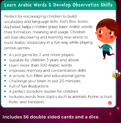 Learn Arabic Words & Develop Observation Skills Perfect for encouraging children to build vocabulary and language skills, Kid's Box: Arabic Alphabet helps children grasp basic Arabic words, their formation, meaning and usage. Children will love discovering and learning new words to build Arabic vocabulary in a fun way while playing various games. A card game for 2 and more players Suitable for children 3 years and above Learn more than 300 Arabic words Improves memory and concentration skills A simple, fun-filled and educational game Challenge your brain in just 15 minutes Full of fun illustrations A perfect boredom buster for children Includes words from topics such as animals, home, school, fruits, and transport. Includes 56 double sided cards and a dice. This expertly designed learning tool combines phonetic recognition with visual association, allowing young learners to internalize Arabic language patterns naturally. The progressive difficulty structure supports developmental milestones, making it ideal for both classroom settings and home learning environments. By engaging multiple learning modalities through card-based gameplay, children retain vocabulary more effectively while building confidence in Arabic communication. The compact 15-minute play sessions respect children's attention spans while maximizing educational outcomes, making this an invaluable resource for parents and educators seeking to establish strong foundational Arabic language skills during critical early learning years.