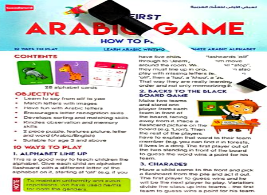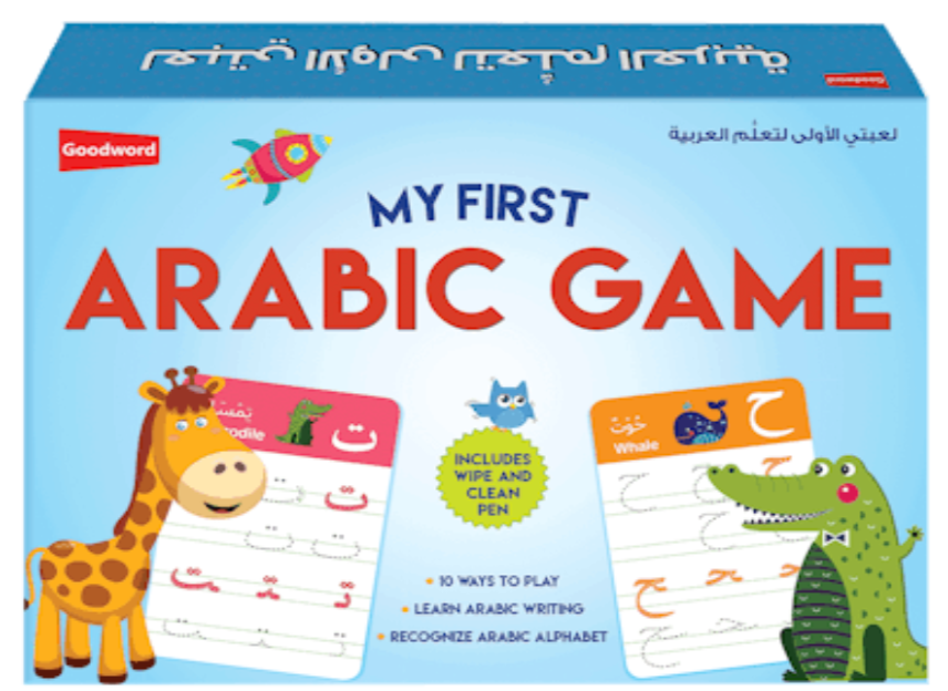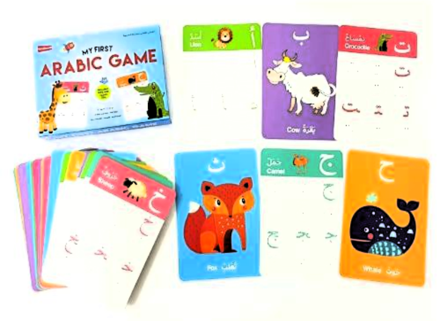 Learn Arabic the fun way with My First Arabic Game! This awesome game has 10 different ways to play, so you'll never get bored. You'll discover Arabic letters, learn new words, and practice writing while having a blast. The colorful cards show pictures of animals, fruits, school stuff, and things from home—things you already know! Each game helps your brain get better at remembering things and paying attention. You can play by yourself or with friends and family, and even just 15 minutes of playtime helps you learn. The game comes with 56 cool double-sided cards, a dice, and instructions for all 10 games. Perfect for kids ages 3 and up, whether you're playing at home or at school. Get ready to have fun while becoming an Arabic superstar!